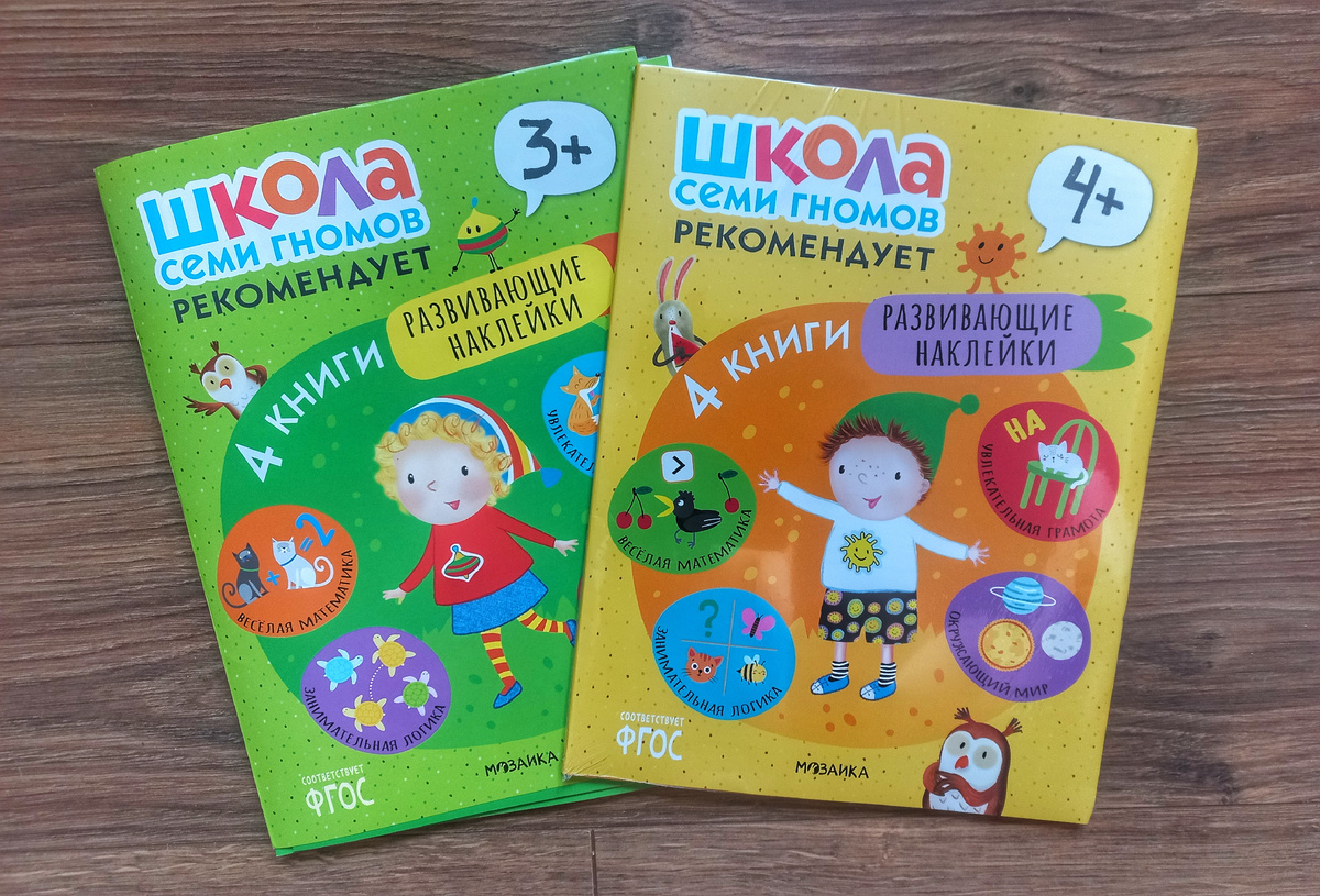 В сентябре как-то зашла в "Фикс Прайс" - любимый магазин многих родителей и учителей - и купила два сборника с наклейками от "Школы семи гномов". Один был на возраст 3+, другой на 4+.