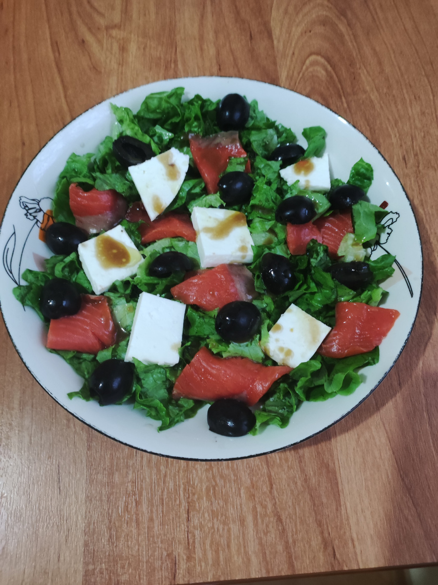 Очень хороший салат, легко и быстро готовить. За счёт особенной заправки вкус получается отменный! Готовлю такой салат порционно. Ничего не перемешиваю, просто сверху поливаю заправкой. Листья салата нарезать или нарвать (кому как удобно), уложить на тарелку. Сверху на листья уложить нерку, нарезанную небольшими квадратами. Между рыбой разместить кусочки сыра и маслины (предварительно разрезала пополам). Сверху полить заправкой. Маленький секрет заправки читать внизу. Салат получается вкуснее, если немного изменить заправку. Вместо мёда и лимонного сока лучше добавить "Наршараб". Это гранатовый соус. Для заправки взять наршараба примерно 0,5-1ч.л. или по вкусу. Соединить с горчицей и оливковым маслом и полить салат. Приятного аппетита!
