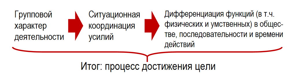 Мы говорили о том, что социальное поведение - важнейшая форма поведения человека. Рассуждали о важности интеллектуализации (обоснования), мотивированности и уменьшении неопределённости в социальном поведении. На какова основная канва социальности поведения в достижении цели? Деловая организация, как упорядоченная целенаправленная группа лиц, имеет в своей основе именно координацию усилий множества людей и распределение между ними функций. Проблемы чаще всего случаются в пограничных ситуациях, когда не чётко определены рамки функций. К примеру, сбор обратной связи по продукту, это ответственность маркетинга или продаж? Перемещение между производственными участками - это ответственность логистики или самих производственных подразделений? Администрирование CRM - это ответственность IT или продаж? А может быть маркетинга? Проблемы в ситуационной координации случаются реже. Обычно, они возникают, когда нужно скорректировать оперативные цели или когда возникает новая перспектива, которая «от
