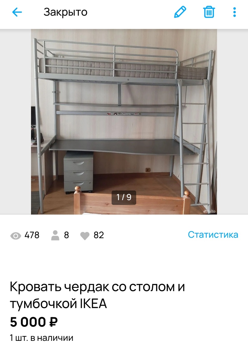 Всем добрый день. Сегодня поделюсь, что уже удалось продать на Авито в этом месяце. В конце октября мне предстоит ремонт. Поэтому времени для продаж мало, а лотов много. За 30 лет, которые мы живем в этой квартире, такого глобального ремонта у нас не было (всегда делали по отдельности - кухню или какую-то комнату), а сейчас за пару недель мне нужно освободить практически всю квартиру. Я ничего не успеваю🙄, но стараюсь хоть немного заработать на ненужных мне вещах. В октябре разделяю отчеты по продажам на несколько, т.к. на текущий момент я получила деньги за 7 заказов и еще 6 в пути - и у меня есть еще неделя для продаж... надеюсь к конце месяца соберется неплохая сумма. Итак, промежуточные итоги Октября: Сентябрь с 1 по 10 - Продано 7 объявлений. Все уже получены покупателями и еще есть заказы в пути (их пока не считаю). Из них три самовывоза. Получена Сумма 7247 рублей Начну с самовывоза: Лот№1 + 5000 руб Кровать чердак Икея. Это кровать сына, ему на ней уже неудобно. Раньше мы в че