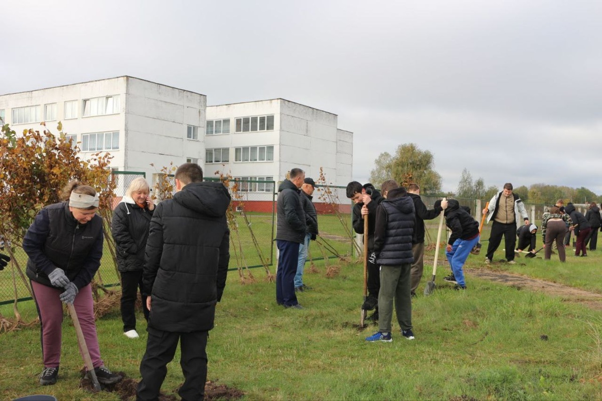 Сегодня работники и учащиеся СШ № 3 р. п. Речица высадили липы вдоль забора за территорией учреждения образования.