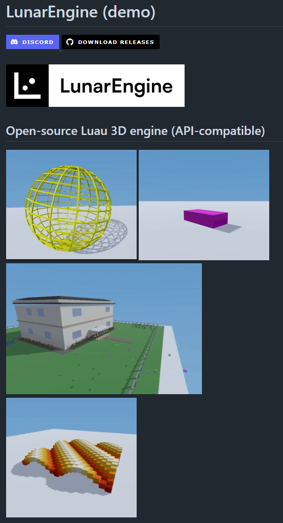 LunarEngine — это экспериментальный игровой движок с открытым исходным кодом, построенный на языке Luau, созданном для Roblox. Он предлагает API в стиле «песочницы» и модель разработки, вдохновлённую популярными sandbox-движками. Благодаря этому, уже существующий код на Luau может работать с минимальными изменениями. * API в стиле Roblox Studio — поддерживаются знакомые структуры вроде game, workspace, Instance, CFrame, Vector3, Color3 и других базовых типов данных. * Модель разработки без ограничений Roblox — Lua-скрипты можно запускать напрямую, вне экосистемы Roblox. * Работа через собственный рантайм — LunarEngine использует движок raylib для визуализации и взаимодействия с системой. * Совместимость с существующим кодом Luau — большинство базовых API и сервисов (RunService, Lighting, Workspace) реализованы или частично поддерживаются. * Открытый исходный код и MIT-лицензия — любой может использовать, изменять и расширять проект. Поддерживается: * Отрисовка сцены и базовое освещение