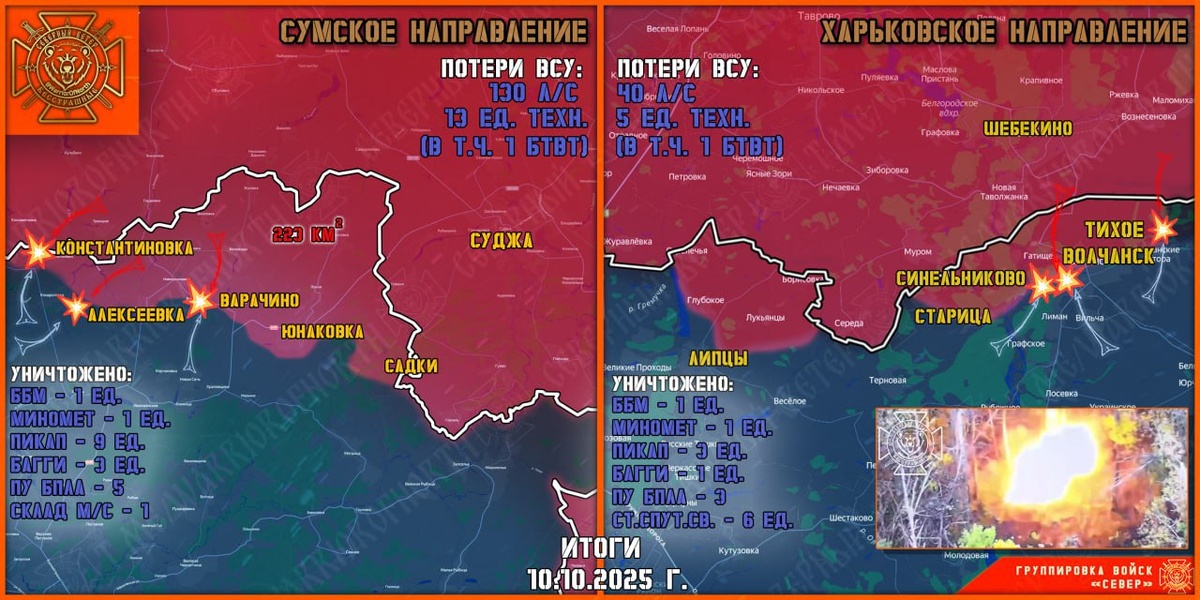 Рядом с курской границей авиация РФ наращивает интенсивность ударов по ВСУ Военкоры телеграм-канала «Северный Ветер» опубликовали сводку о положении дел на фронте на утро 11 октября. Как следует из информации, рядом с Курской областью в Сумской на всем участке фронта продолжаются ожесточенные бои. Бойцы РФ продвигаются на правом фланге наступления, отражая контратаки противника. При этом российская авиация и артиллерия увеличила интенсивность ударов по позициям ВСУ. На правом фланге в лесах продвинулись штурмовые группы ВДВ и морской пехоты. Продвижение составило 300 метров. Они закрепились. Поясняется, что в районе Алексеевки ВСУ пять раз атаковали позиции военных РФ. - Комплексным огневым поражением все атаки отражены, при этом уничтожено до 90 процентов личного состава вражеских штурмовых групп и ББМ «Хамви», - рассказали военкоры.