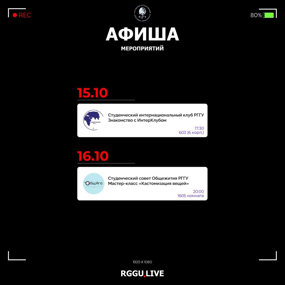 🥳 Афиша предстоящих мероприятий 📢 Студенческий интернациональный клуб РГГУ приглашает на знакомство с ИнтерКлубом 📌 15.10/ 17:30/ 603 (6 корп.) Подробнее здесь 👈 📢 Студенческий совет Общежития РГГУ организует мастер-класс «Кастомизация вещей» 📌 16.10/ 20:00/ 1605 комната (ул. Кировоградская, д. 25) Подробнее здесь 👈 ✍️ Мария Пиюк, 4 курс ФУ 🎨 Анна Дёмочко, 2 курс ФМиР ⚪ Подписывайся на RGGU.LIVE #РГГУ #СтудентРГГУ #АфишаРГГУ