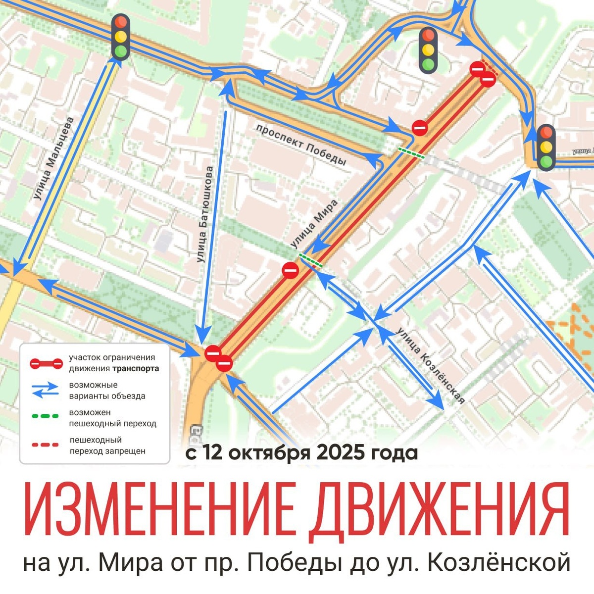 💭 Недавно писал о том, что на следующей неделе начинаем строительство участка тепловой сети на проспекте Победы. Для проведения работ будет ограничено движение. Изначально подрядчик планировал начать работы 15 октября, но срок сдвинули вправо – приступаем в конце следующей недели, ближе к выходным, чтобы не создавать пробки в середине недели. 🔵Для разгрузки транспортной сети в центре города с 12 октября открываем двустороннее движение по участку улицы Мира от Козлёнской до проспекта Победы. Оно будет организовано в обоих направлениях по четной стороне улицы. Также откроем для движения часть проспекта Победы от Торговой площади до Мира. 🔵Работы по строительству участка тепловой сети начнутся в конце следующей недели. Сетевики будут работать в районе дома № 33 по проспекту Победы, рядом с перекрёстком с улицей Мальцева. Этот участок четырёхполосной дороги будет заужен до двух полос – по одной в каждом направлении. В связи с проведением работ также будут запрещены левые повороты на