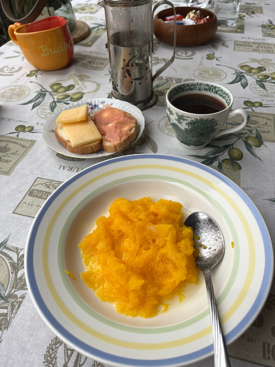 Утром на завтрак была тыква 🎃 Пробую первую с соседского урожая, выросшего на заборе с нашей стороны и разделенного по дружески на пополам🤝 Снаружи она еще светло-желтая, да и внутри семечки до конца не сформировались, до конца вызреть не успела. Ну и на моем окне в кухне ей уже не дозреть. Поэтому решила разрезать и попробовать. Приготовила ее в микроволновке со сливочным маслом и сахаром, и очень даже вкусной она получилась, не смотря на свою недоспелость. Так что в ближайшее время мне обеспечены завтраки с тыквенных блюд. 👌 Сегодня с утра снова моросит мелкий дождь.. не то дождь, не то изморось.. Воздух очень хороший, но делать что-либо под такой мокренью не очень хочется. Жалею об одном, что в день возвращения из Курчатова не посадила чеснок. Это был четверг, день стоял тихий и теплый. А я кинулась собирать листву.. вот она мне сдалась на тот момент.. лучше бы заглянула в прогноз погоды и увидела.. что со следующего дня обещали каждый день дождь. Тогда бы и посадила.. но вр