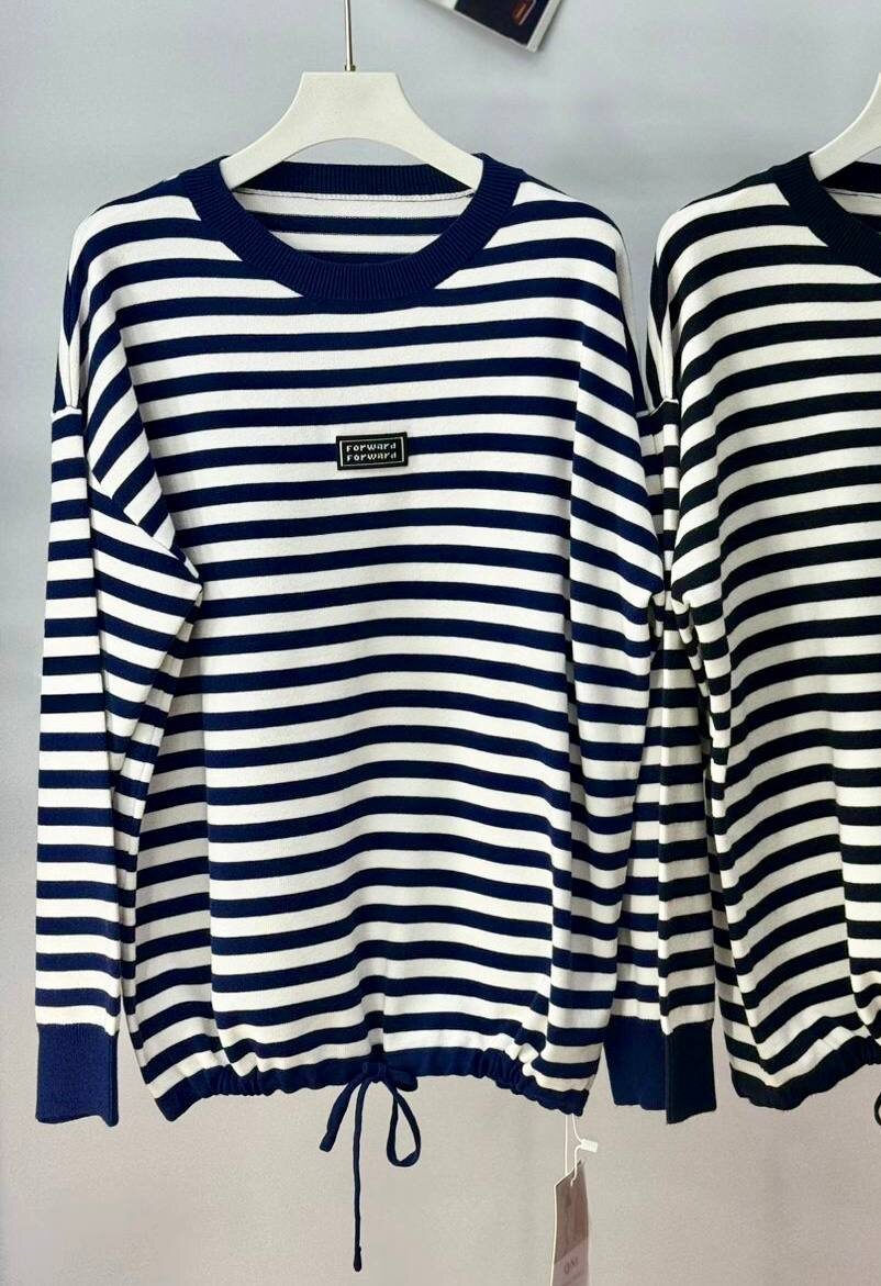 Трикотажный тонкий свитшот в синюю полоску, внизу кулиска