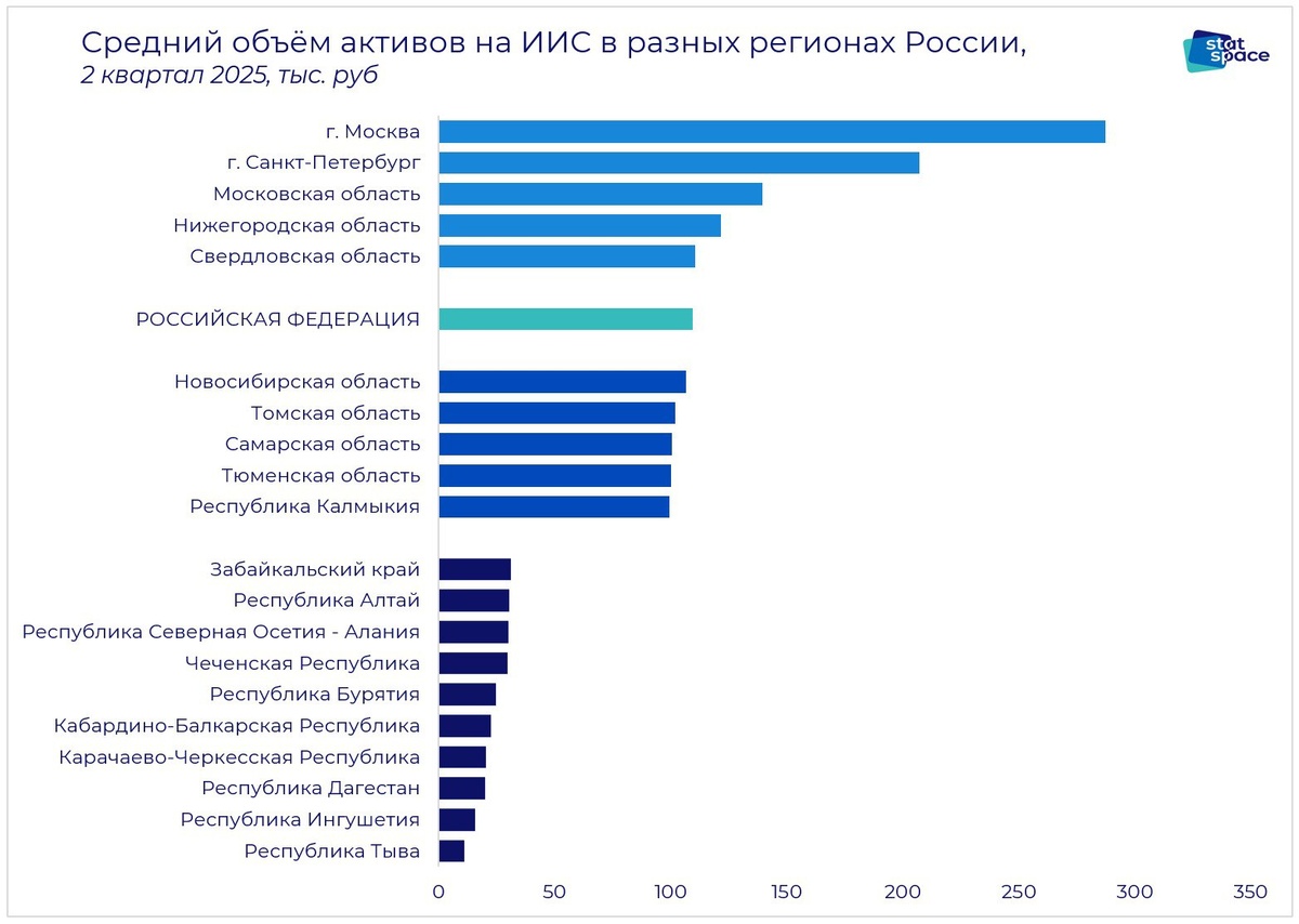 Индивидуальные инвестиционные счета россиян: региональный разрез У среднего (обладающего ИИС!) россиянина на этом самом ИИС лежит 109 тысяч рублей. Довольно скромно, честно говоря! Ещё грустнее выглядит тот факт, что только в пяти регионах средний объём средств на ИИС оказался выше среднего по стране: в Москве (287 тысяч), Питере (207), Московской (139), Нижегородской (122) и Свердловской (111) областях! На эти же пять регионов приходится 26.7% от всех держателей ИИС. Самые скромные объёмы средств на ИИС хранятся у жителей Тывы (в среднем - 11 тысяч рублей!), республик Кавказа (в диапазоне 20-30 тысяч), Бурятии (25), Алтая (30) и Забайкалья (31).