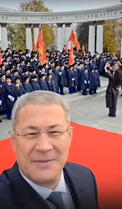 Глава Башкирии Радий Хабиров на своих страницах в соцсетях поздравил школьников, которых посвятили сегодня в шаймуратовцы. Автор поста сообщил, что церемония состоялась на Советской площади рядом с памятником легендарному комдиву – генералу Шаймуратову. Виновники торжества пополнили дружную семью наследников имени генерала, которая уже насчитывает около шести тысяч ребят. «Учиться в таком классе – высокая честь и огромная ответственность. Кроме обычной программы шаймуратовцы проходят дополнительную подготовку по спортивному и военному направлениям, занимаются в кружках, посещают факультативы. Уверен, новое пополнение будет гордо носить символику шаймуратовцев. Они будут достойны подвигов наших великих предков, многих поколений защитников Отечества. Поздравляю ребят и их родителей. Желаю всем успехов и больших высот в жизни», – отметил Радий Хабиров. Скриншот видео со страницы ВКонтакте главы РБ.