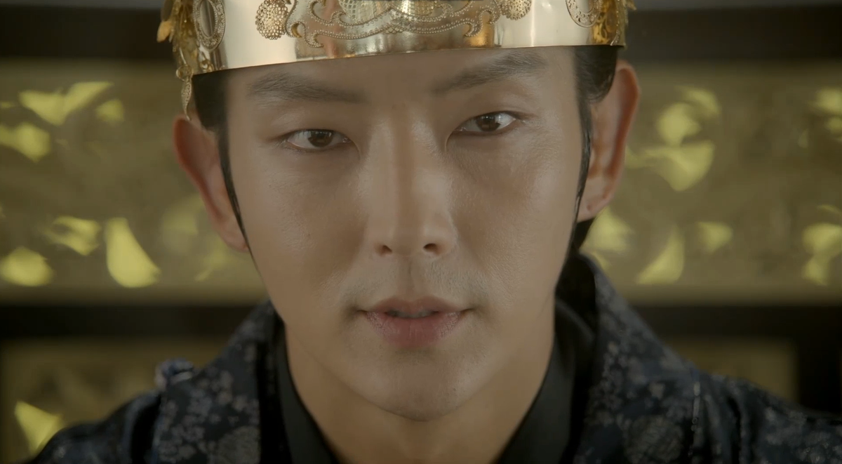 Первое мгновение — действительно тень раздражения. Со будто бы хмурится, взгляд острый, губы слегка поджаты. Простодушный зритель решит, что король зол. Но если приглядеться — это вовсе не гнев, а оценка. Он считывает реакцию, словно актёр, наблюдающий партнёра на сцене. Это пауза, в которой он прогнозирует возможную реакцию Енхвы на слова, которые собирается сказать.