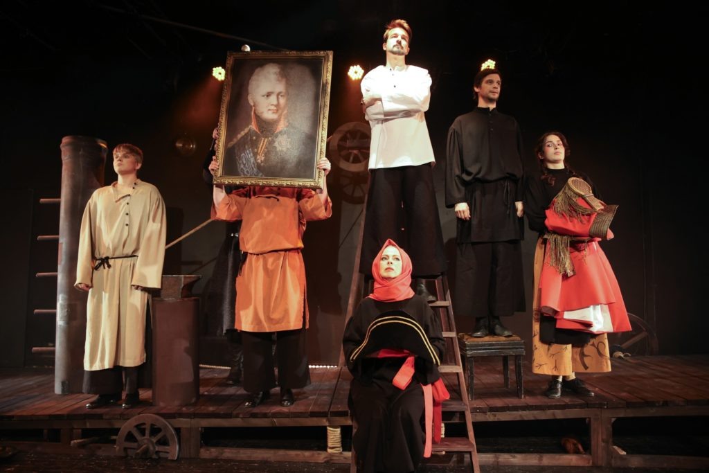В этих декорациях необыкновенно ловко существуют персонажи спектакля: благодаря выразительным костюмам и проворству артистов, играющих несколько ролей, кажется, будто сцена густонаселена, а ее пространство весьма обширно. Интеллигентный Антон Войналович очень убедителен в роли двух, в общем-то, очень разных государей — Александра I и Николая I. Он же — внятный и точный голос Рассказчика, обладающий доходчивостью, способной убедить недоверчивых зрителей в том, что все происходящее — чистая правда.