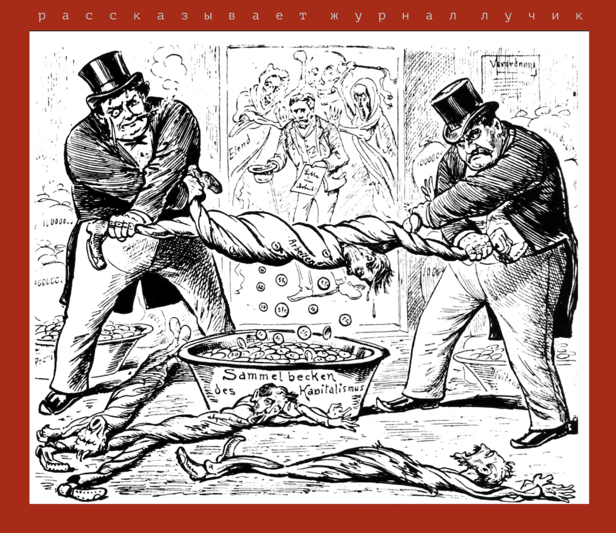 ...У тех, кто становится богаче, растут «потребности». Например, если раньше такой ездил в повозке, запряжённой одной лошадью (не забывайте, мы с вами в XIX веке, автомобиль ещё не изобрели), то теперь ему надо шесть лошадей – иначе «неприлично»! А на содержание большой конюшни надо гораздо больше денег. И так во всём. Вот он и думает, как бы ещё больше денег выжать из своих рабочих. «Эх, жаль нельзя им зарплату уменьшить… А может, норму выработки увеличить? Тогда они получать будут столько же, а делать больше! А кто не выполнит норму, тех штрафовать! А если детей на работу нанимать? Им же надо меньше еды, а значит, и платить им можно меньше…» Вот так и получается: чтобы один богател, тысяча должны беднеть... Ну, а если люди просто не могут делать больше? Ну не могут – физически! Они просто умрут от усталости!.. Тут-то богачи и зовут на помощь «прогресс». – А подать сюда инженера Ляпкина-Тяпкина! Слышь, Ляпкин? Придумай такую штуку, чтобы рабочий на десяти станках одновременно работ