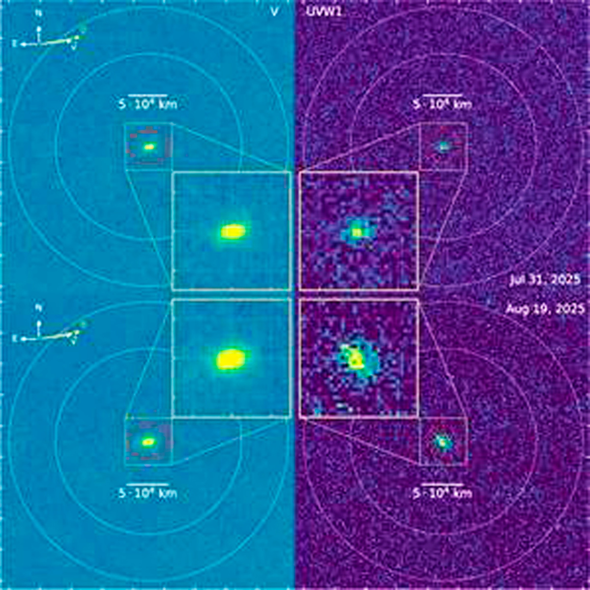 Тем временем Swift продолжает наблюдения. Аппарат зафиксировал, что активность 3I ATLAS меняется каждые несколько часов — словно выбросы происходят импульсами. Это согласуется с прежними измерениями оптической яркости, которые показывали регулярные колебания раз в четыре часа. Такое поведение нехарактерно для комет: если бы речь шла о вращении, светимость менялась бы плавно, а здесь наблюдается резкий «пульсирующий» ритм.