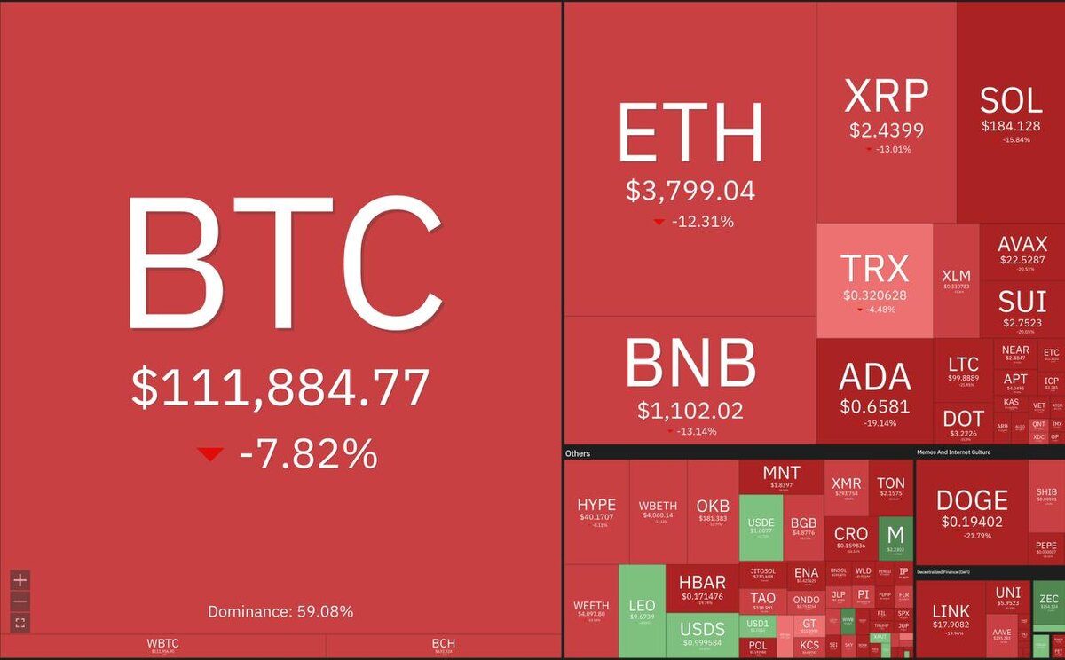 Прошедшей ночью фондовый и криптовалютный рынки полетели в бездну после заявлений президента США Дональда Трампа о введении 100% пошлин на весь импорт из Китая. Мы наблюдали, как за один час наши активы превратились в пыль. Было ликвидировано свыше $3,3 млрд позиций — в основном лонгов по альткоинам. Суммарные потери за сутки превысили $19 млрд, ликвидировано более 1,6 млн трейдерских позиций. Просели как крупные монеты — BTC, ETH, BNB, — так и другие. Из самых медийных, возможно, больше всех пострадал TON. Американские фондовые рынки также закрылись в минусе, да так, что это крупнейшее падение с апреля: S&P 500 — 2,7%, Nasdaq — 3,6%, Dow Jones — 1,9%. Тарифы должны начаться с 1 ноября 2025 года, но Трамп допустил, что это может произойти и раньше, если не увидит от Пекина ответных шагов. Рынок немного отскочил вверх после того, как появилась информация, что встреча Трампа и Си не отменена. Ну а вообще у нас появляется почва для обвинений Трампа в спекуляциях и намеренных манипуляц