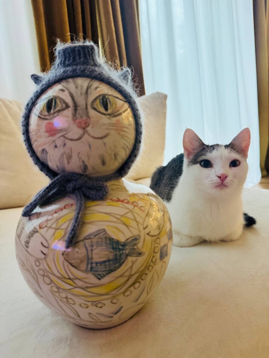 Когда творчество зеркалит и не важно как было задумано. 🫣😅 Кажется, вышла копия Матильды. Шапочка связана специально под вазу. К похолоданию готовы. Мяу.