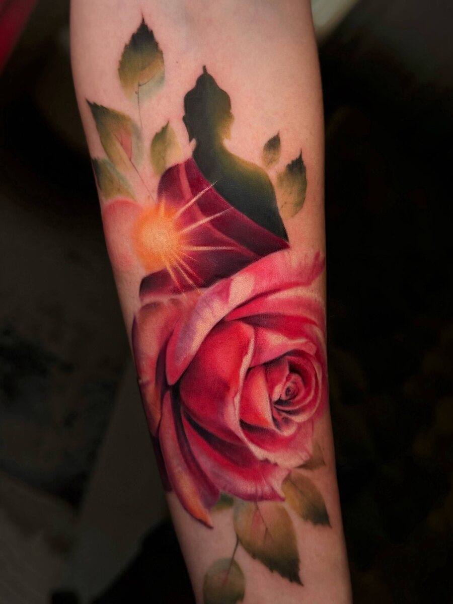 Есть задачи, которые проверяют тебя на прочность. Та самая, от которой уже хотели отказаться... Моя клиентка страстно желала соединить два, казалось бы, несоединимых объекта, но гармония не поддавалась. Спустя часы поисков она согласилась на компромисс — просто розу. Но в тот момент для меня это перестало быть просто заказом. Это стал личный вызов. И я рада, что не отступила. Наш замысел обрел ту самую гармонию, о которой мы мечтали. Будда — напоминает самому себе о главном: «Дыши, не психуй, всё будет ок». · Роза — ну, это просто про красоту жизни. Со всеми её «шипами» — сложностями, которые делают нас сильнее. Вместе они создают крутой визуал и глубокий посыл: живи в гармонии, цени красоту момента, но помни — без шипов розы не бывает. 😉 Готовы набить свой кусочек гармонии?