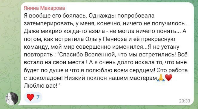 🥰Какое же счастье творить не из долга, а из любви. 🔹И если хоть еще один человек сменит страх работы с шоколадом на безграничную любовь к нему 🔹и начнет воспринимать его как прекрасный материал для творчества, дающий свободу, а не сложное сырье с кучей непонятных требований, моя миссия уже будет исполнена🤗. Начните с зимнего марафона шоколадного декора работу со своими страхами: https://t.me/winter_decour_bot?start=start