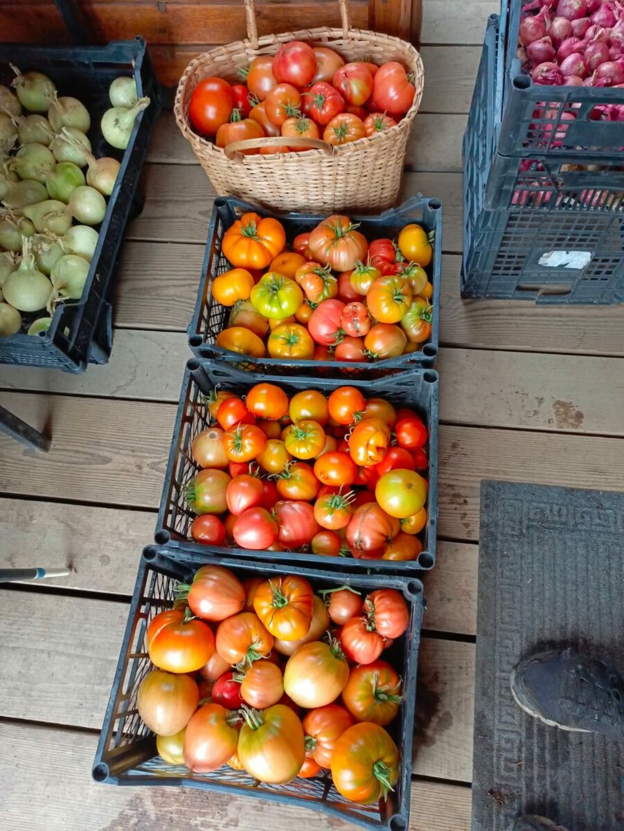 Для приготовления я использую продукты с сада: помидоры, хрен и чеснок. Собрали помидоры. Помидоры покраснели, пора делать хреновину. Для хреновины подойдут помидоры любой формы.