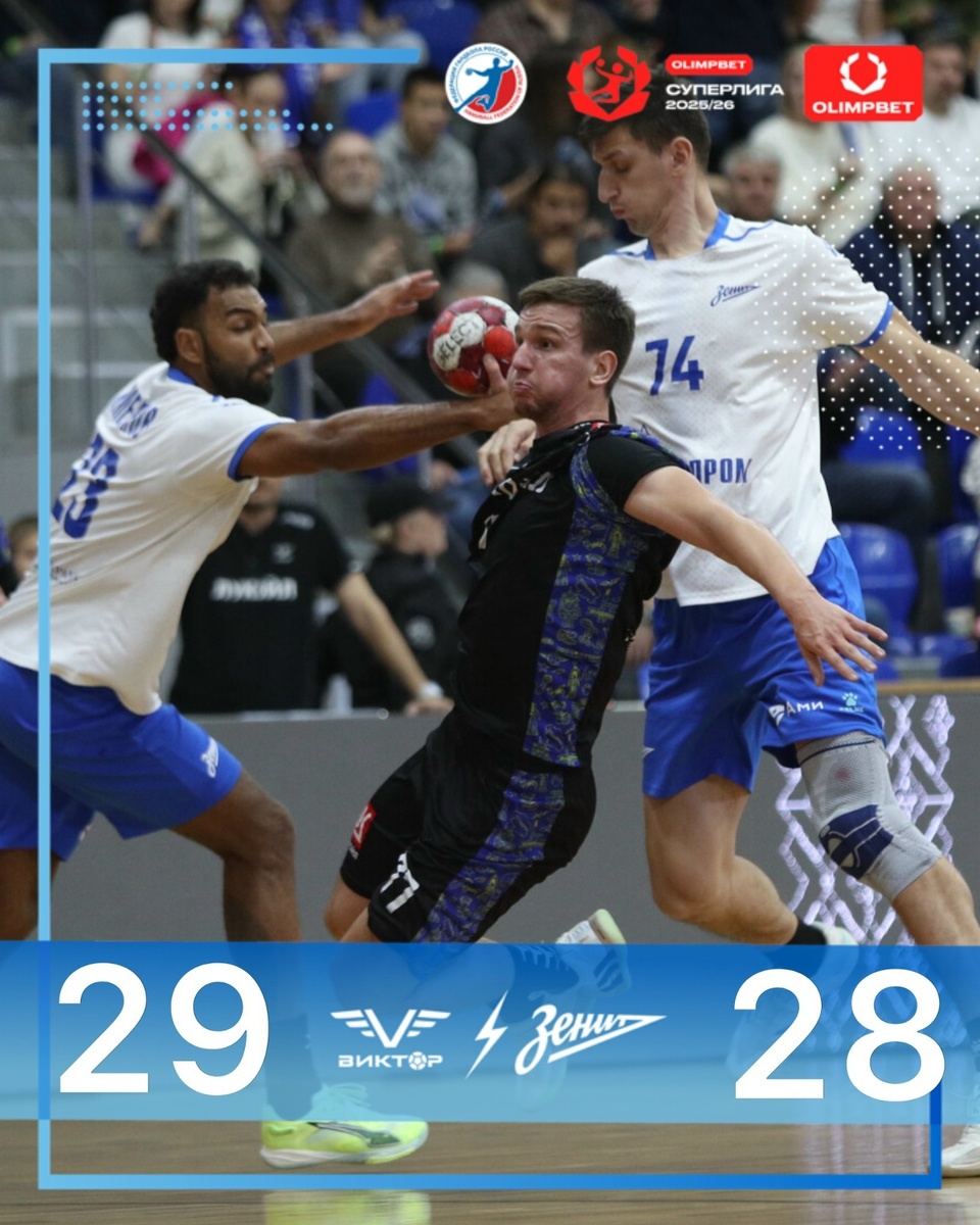 Сегодня в мужском чемпионате России состоялась одна игра. "Виктор" принимал "Зенит". Всё решилось на последних секундах встречи. После гола Дмитрия Хмелькова, который, казалось, принёс "Зениту" ничью, полусредний хозяев Иван Некрасов успел поразить пустые ворота гостей. 11 октября Виктор - Зенит - 29:28 (15:15) (Сазонов - 9, Беляев - 5; Бохан - 7, Луня - 5) Турнирное положение. 1.ЦСКА - 11 очков (6 матчей). 2.Зенит - 10 (6). 3.Пермские медведи - 10 (5). 4.СКИФ - 8 (6). 5.Чеховские медведи - 8 (6). 6.Виктор - 8 (7). 7.Динамо-Сунгуль - 5 (6). 8.СГАУ-Саратов - 4 (6). 9.МССУОР №2 – Академия - 4 (6). 10.Динамо - 4 (7). 11.Каустик - 2 (5). 12.Скиф - 0 (7). Фото: vk.com/hbcvictor