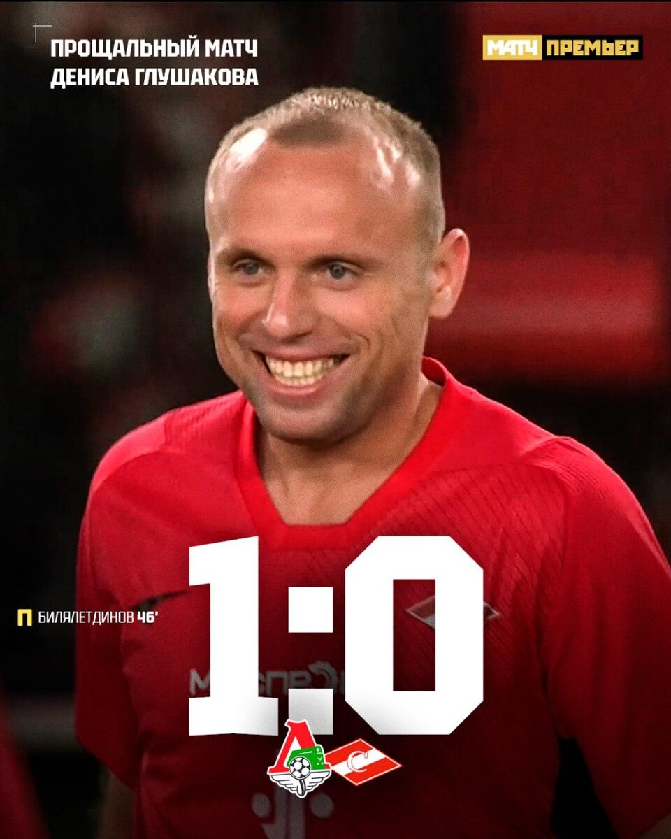 👋 Вот и всё: Глушаков простился с футболом! В Химках завершился прощальный матч экс-полузащитника сборной России. В игре приняли участие легенды «Спартака» и «Локомотива». Сам Глушаков провёл по тайму за каждую из команд. Милая деталь: перед началом игры символический удар по мячу нанёс маленький сын футболиста. Сама же встреча завершилась победой железнодорожников с минимальным счётом 1:0. Единственный мяч в начале второго тайма с пенальти забил Динияр Билялетдинов, который, кстати, тоже выступал и за «Локо», и за «Спартак». ♥️ Будете скучать по Глушакову? @russian_rt_sport