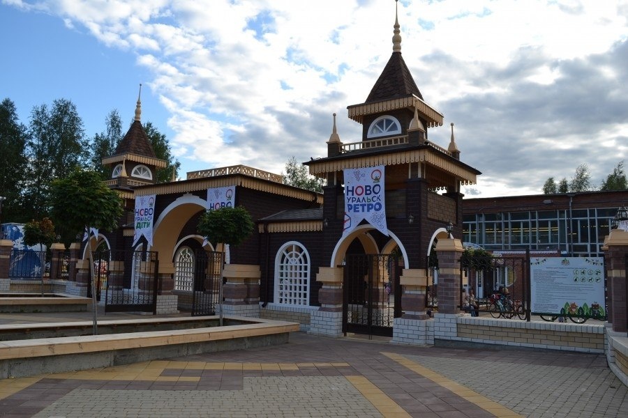 Вход в парк города Новоуральск (Свердловская обл.) и детская площадка в нём же