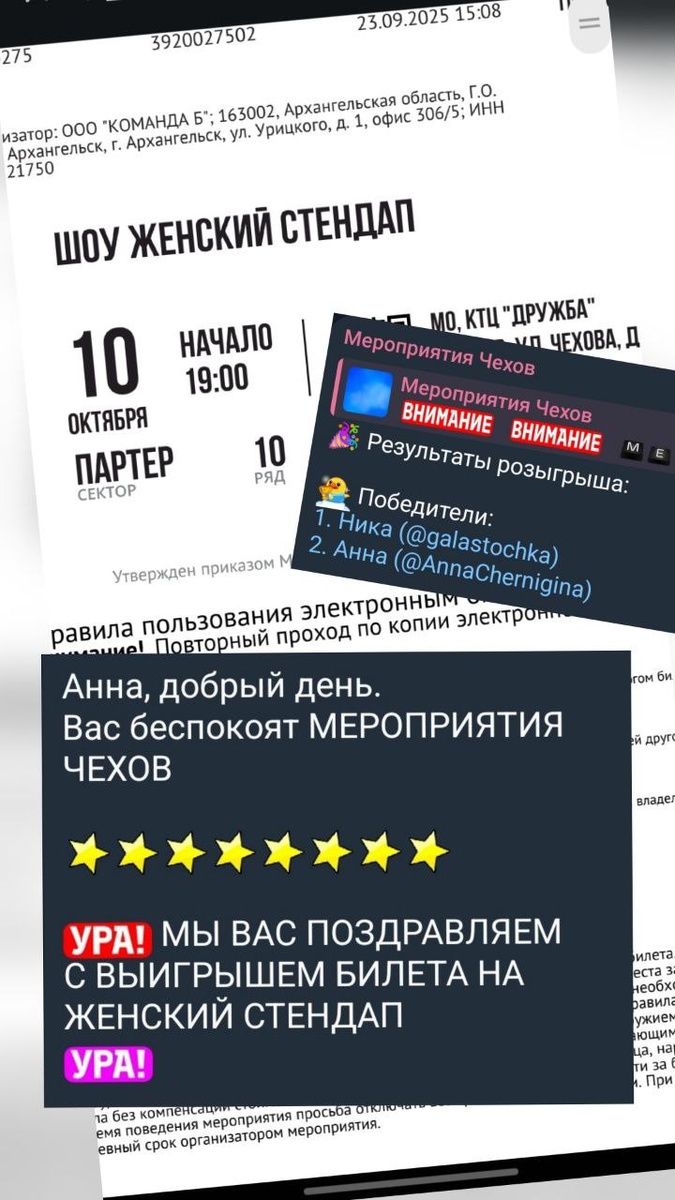 ✨ НОВОСТИ. Анна, победительница нашего розыгрыша БИЛЕТОВ НА ЖЕНСКИЙ СТЕНДАП поделилась отзывом о посещении АННА НАМ НАПИСАЛА Благодарю Ваш канал за этот замечательный розыгрыш и за билет в центре зала ❤️ Я в восторге от "Женского сдендапа". Девчонки шутили горячо и было весело. Вечер был чудесным 😍 📆 10.10.2025 🏢 ДК «Дружба» 📍 г. Чехов, ул. Чехова, д.45 ⭐Поддержать канал голосом ✅ Мероприятия Чехов https://dzen.ru/id/66cc4b48e9ef144699238a51 http://vk.com/chekhov_events http://dzen.ru/chekhov_events