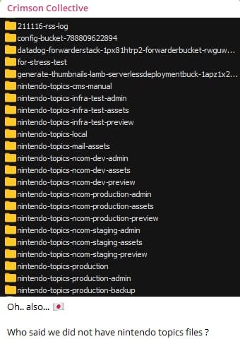 По слухам, Nintendo стала очередной целью хакерской группы Crimson Collective. В сети появился скриншот с папками «файлов тем Nintendo», на которых группа заявляет о наличии данных компании. На момент публикации японский разработчик официально не подтверждал взлом.