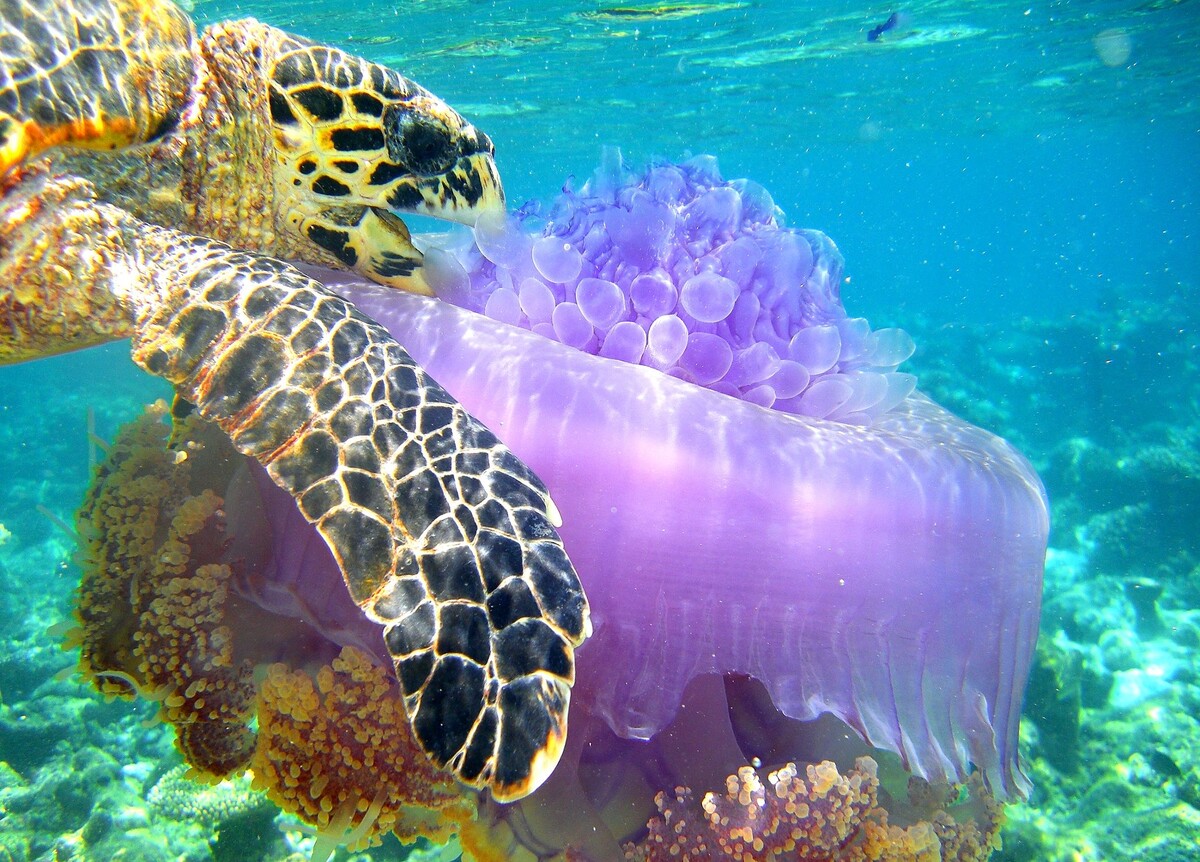 Зеленые морские черепахи (Chelonia mydas) питаются не только водорослями, но и медузами, такими как ушастая аурелия (Aurelia aurita) или другие виды медуз. Удивительно, но их толстая кожа защищает от ядовитых щупалец.