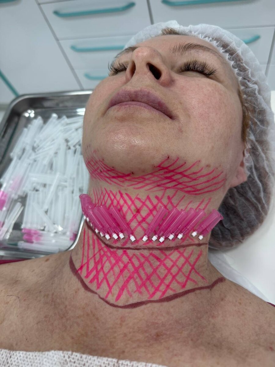 30-40 нитей на шею и от 20-30 на зону второго подбородка. Формирование интеллектуального коллагена и армирование колец Венеры 🫶