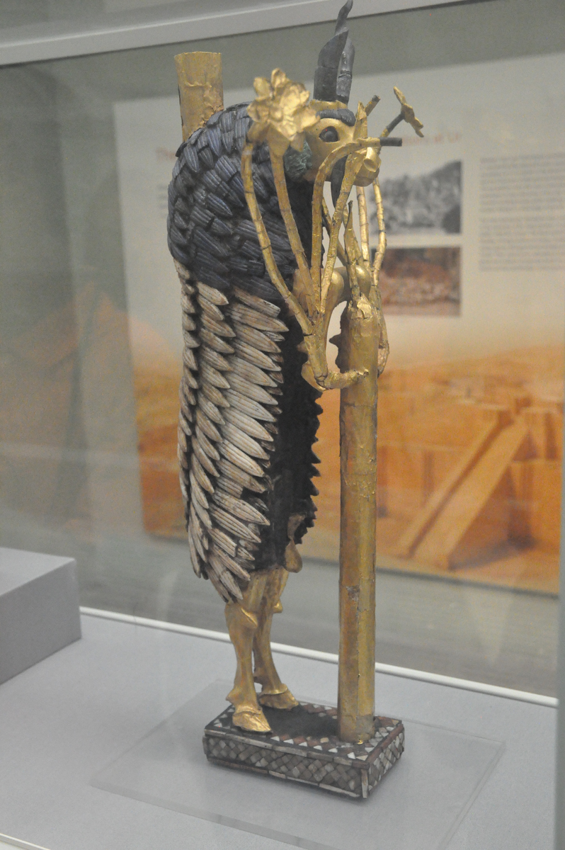 Но самое поразительное было снаружи, в шахте, ведущей к склепу. Там лежали останки пятидесяти двух придворных, отправившихся вместе с ней в мир иной. Десять придворных дам в таких же, но чуть более скромных золотых уборах, лежали двумя ровными рядами. У входа застыли воины в медных шлемах с копьями в руках. Рядом с ними — две богато украшенные повозки, запряжённые быками, и их погонщики. А в углу сидела арфистка, её руки так и остались лежать на струнах великолепной арфы, украшенной золотой головой быка с бородой из лазурита.