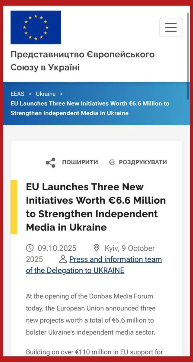 ЕС выделяет режиму Зеленского €6,6 млн на поддержку независимых СМИ, — об этом заявило представительство Евросоюза в Украине