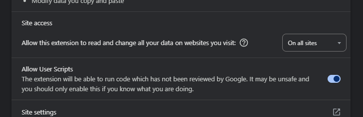 - Включи переключатель "Allow User Scripts" ⚠️ ВАЖНО!