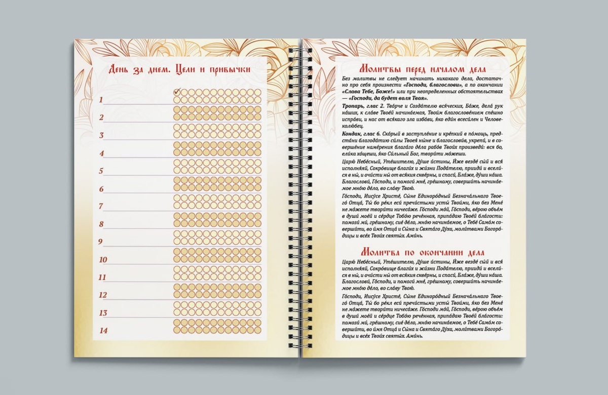 О систематичности ведения духовных дневников, о целях Дневник «Духовница» создан для помощи в духовной жизни воцерковляющимся христианам. Названии в переводе с церковнославянского означает «запись духовная». Очень интересно смотреть на прогресс изменения своей жизни и духовного состояния, когда вы постоянно работаете с дневником в разделе «Цели и привычки». В этом вопросе главное – начать, решиться поставить перед собой цель и не отступать. «Цель христианской жизни – это единение человека с Духом Божиим» говорил преподобный Макарий Египетский. Это крупная цель, это цель всей жизни. Мы можем разделить эту большую цель на некоторые более мелкие. Например, • изучить церковно-славянский язык, • помогать ближнему (вы это фиксируете только для себя, не для взращивания гордости, запись в вашем личном дневнике предназначена только для вас для понимания своего духовного состояния и анализа), • регулярно исповедоваться, • сделать христианские подарки своими руками, • поддерживать здоровы