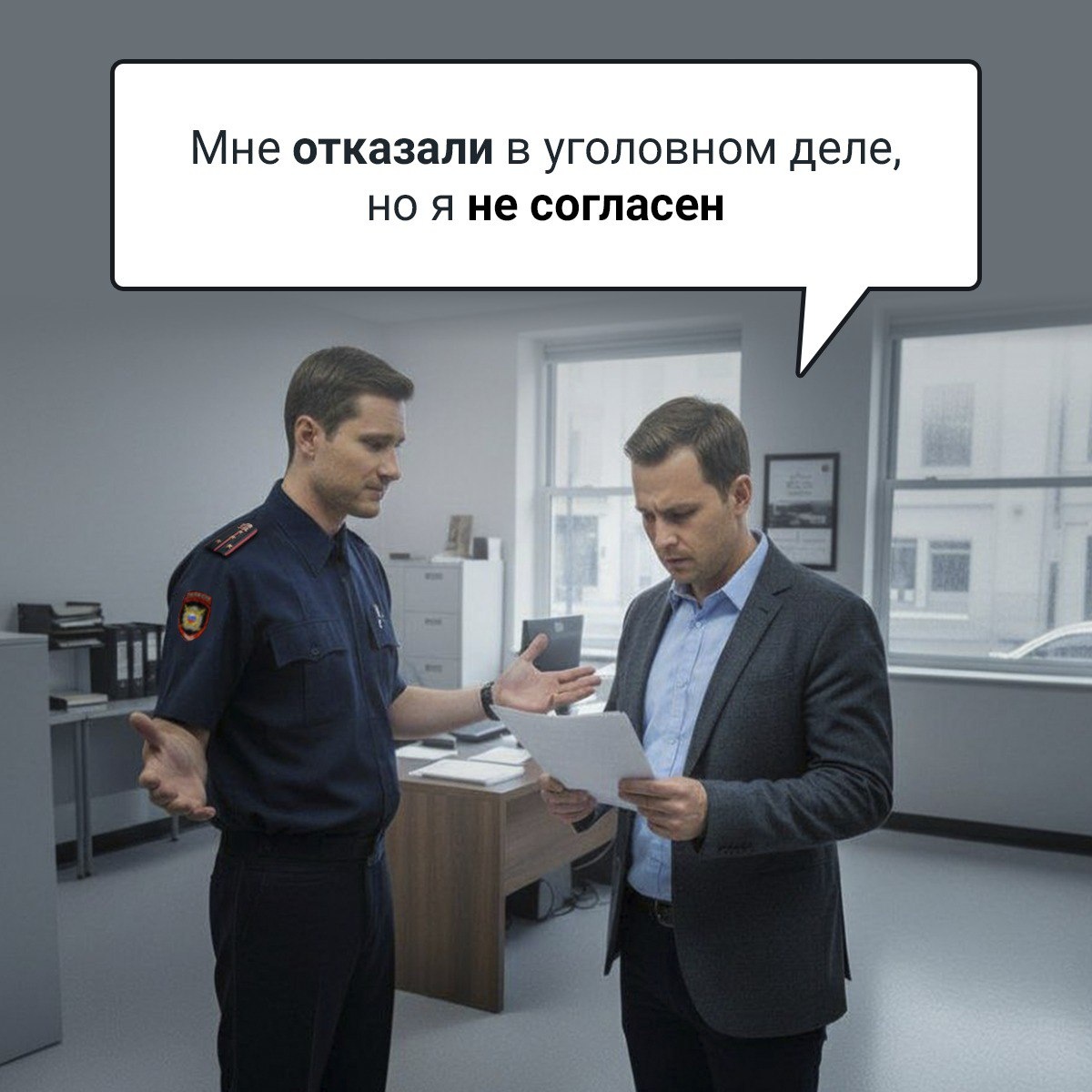 Полиция отказала в возбуждении уголовного дела? Ваши действия Если вы столкнулись с отказом полиции, но уверены, что преступление совершено — это не конец истории. Закон дает вам инструменты для обжалования. Шаг 1: Получите официальный документ об отказе. Ваша первая задача— получить на руки «Постановление об отказе в возбуждении уголовного дела». Без этого документа вы не сможете никуда обратиться с жалобой. Требуйте постановление от сотрудника принявшего решение. Шаг 2: Скрупулезно изучите постановление. Не просто прочтите, а проанализируйте текст. Закон требует, чтобы отказ был законным, обоснованным и мотивированным. Обратите внимание на два ключевых момента: • Все ли ваши доказательства учтены? Если вы прикладывали письменные или вещественные доказательства к заявлению, а в постановлении о них ни слова — проверяющий орган может расценить это как нарушение. Сотрудник не дал им оценки, и такой отказ не может считаться обоснованным. · Соблюдена ли форма? В документе должны быть четк