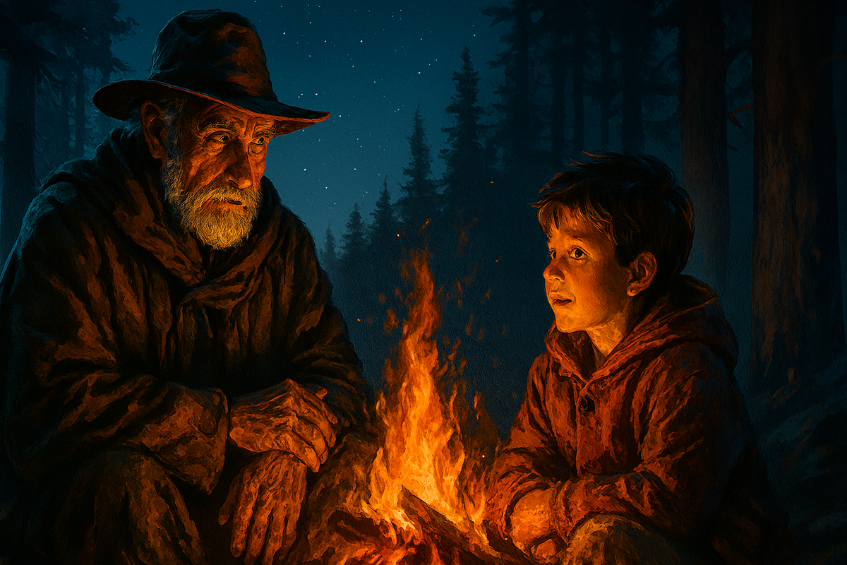 Ночь стелилась по земле, как старый тёплый плед — мягко, осторожно, убаюкивая всё вокруг. Сосны... Молчаливые великаны, будто слушают сказки ветра, который то и дело замирает между лапами веток. Костёр трещал — весёлый, непоседливый — и выплёвывал вверх золотые искры. Они исчезали мгновенно, одна за другой. Точно мысли — появились... и нету. Старик сидел у огня, кутаясь в поношенный, но любимый плащ. Глаза его были задумчивы, взгляд уносился сквозь пламя — далеко-далеко, куда-то за горизонт ночи. Он не спешил говорить. Просто сидел, греясь в танце огня, словно вспоминал что-то очень личное. Рядом — мальчишка. Скрутился калачиком, обнял колени, уставился в ночь, но всё время поглядывал на дедушку. Хочется спросить — и страшно. Но наконец шепчет, хрипло, почти неуверенно: — Дедушка... а почему я то хочу сделать что-то хорошее, то — э-э... совсем наоборот? Внутри меня будто два человека дерутся... Старик оглянулся, улыбнулся уголком губ. Словно только этого и ждал. Взял сухую ветку, медле