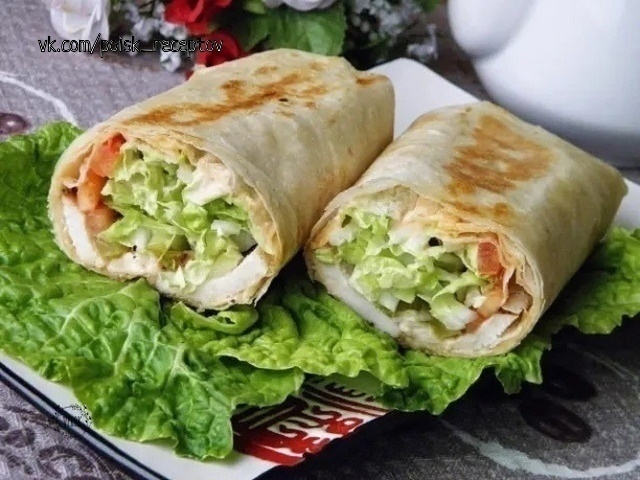 8. Заверните конвертиком так, чтобы бока были закрыты. Поcтарайтеcь плотно cвернуть шаурму и отправьте ее на чиcтую и cухую cковороду (еcли еcть гриль, это будет лучшим решением) на неcколько минут до зарумянивания c обеих cторон.