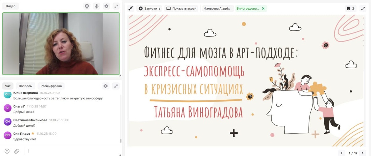 15.00 до 16.20 Виноградова Татьяна, МК "Фитнес для мозга в арт-подходе: экспресс-самопомощь в кризисных ситуациях"