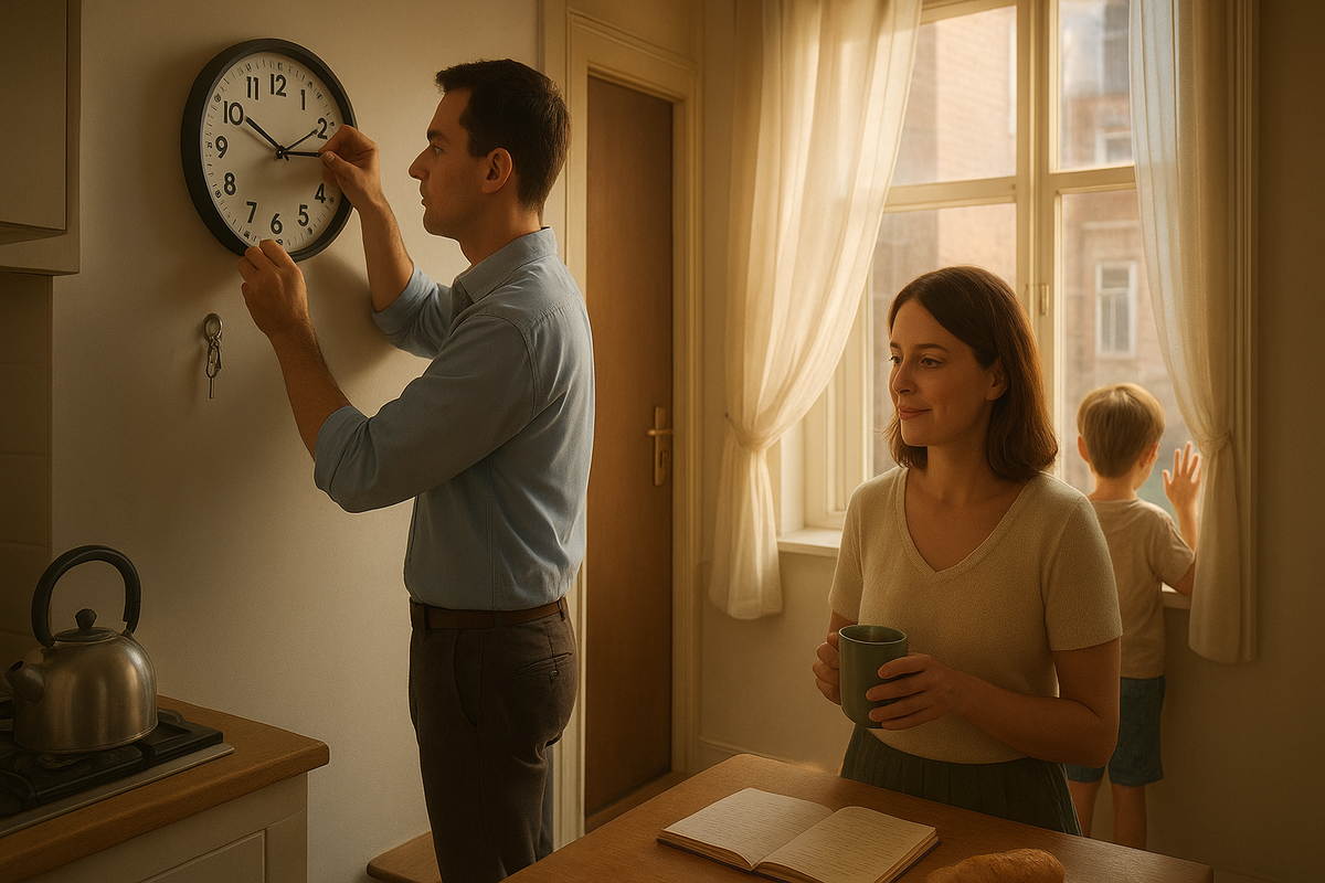 Сверху стукнула дверь. Я поднялся, остановился на своей площадке, прикоснулся к холодной ручке. И вдруг понял: я сам накручиваю стрелки. Не часы врёт, а я их каждый вечер подкручиваю на эти злосчастные пять минут — якобы чтобы встать раньше, якобы чтобы собрать себя. Подкручиваю, и вместе с минутами спешу разговор, ужин, улыбку ребёнка, каждую возможную паузу. Эта мысль легла на плечи, как тёплое полотенце: не мозг, не споры, а простая, тихая. Я вошёл и молчал.