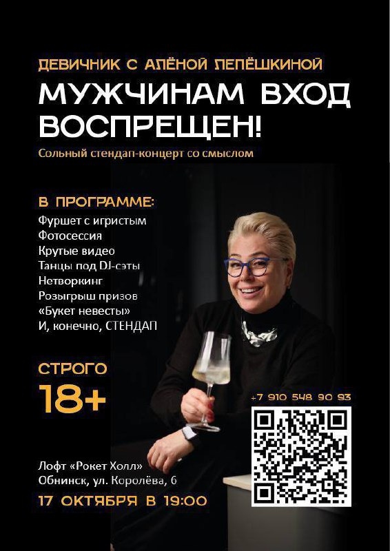 🎤 НАКОНЕЦ -ТО МОЖНО ГОВОРИТЬ ВСЛУХ! 🌸 Стендап - девичник с Алёной Лепёшкиной в Обнинске, на котором не стыдно смеяться! 🚫 Мужчинам вход запрещён. 📅 17 октября 2025 📍 Лофт “Рокет Холл”, Обнинск ✨ В программе: 🥂 Фуршет с игристым 📸 Профессиональная фотосессия (и селфи, которые жгут ленты) 🎬 Крутые видео 🎶 Танцы под DJ-сэты и разговоры в окружении лучших обнинских красавиц Подробности и билеты тут: https://alenalepeshkina.ru/standup_obn_171025 Организатор: Елена Гурьянова +79105489093 Подписаться | Ваша реклама