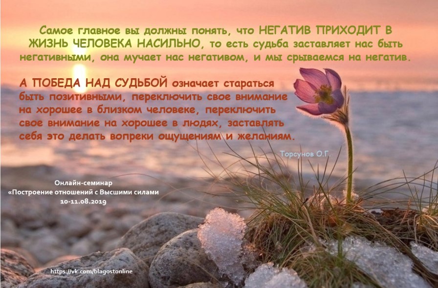 Самое главное вы должны понять, что негатив приходит в жизнь человека насильно, то есть судьба заставляет нас быть негативными, она мучает нас негативом, и мы срываемся на негатив. А победа над судьбой означает стараться быть позитивными, переключить свое внимание на хорошее в близком человеке, переключить свое внимание на хорошее в людях, заставлять себя это делать вопреки ощущениям и желаниям.