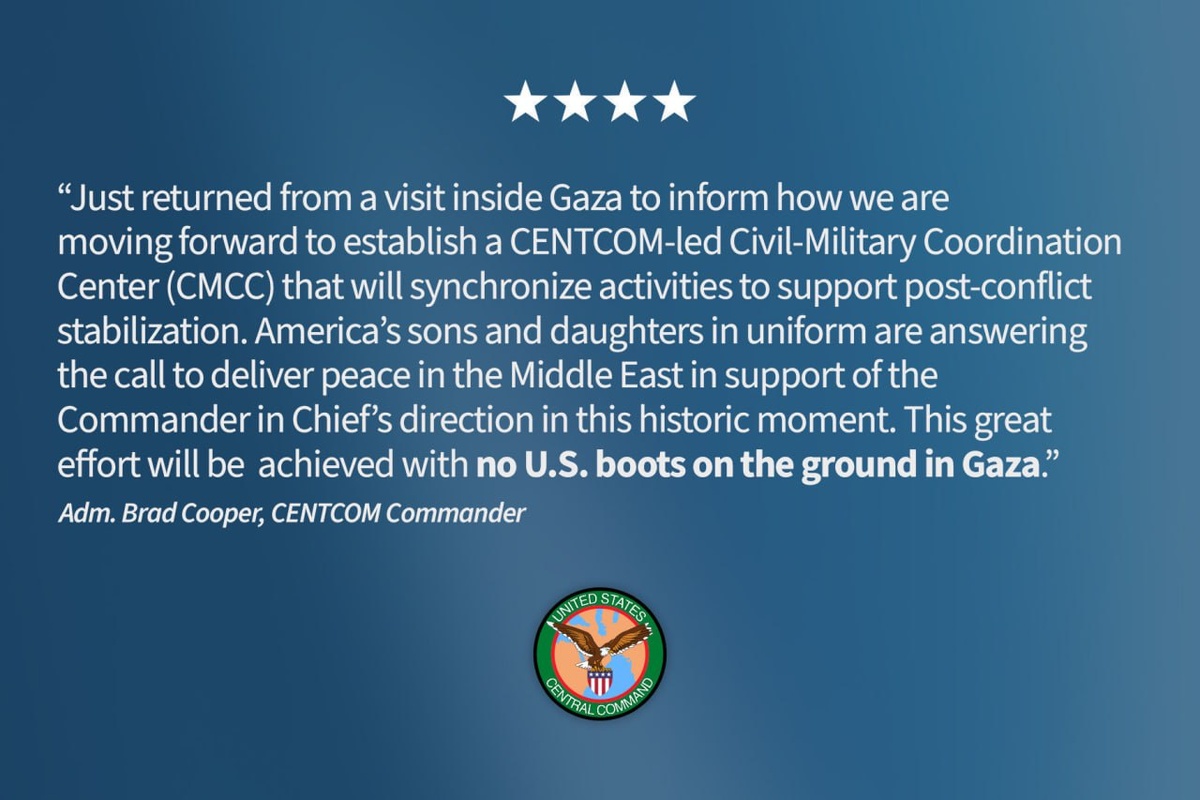 В ответ на пост CENTCOM's Admiral Cooper confirms he made trip And there'll be 'NO US boots on the ground in Gaza' Getting ready to establish 'Civil-Military Coordination Center' to support 'post-conflict stabilization'