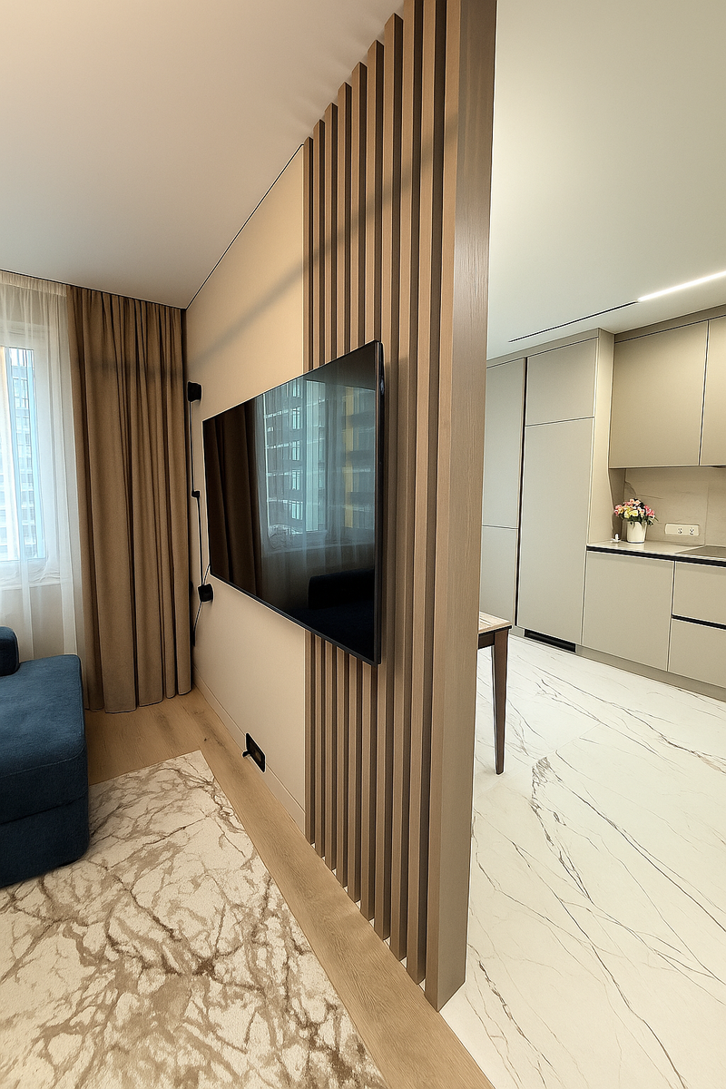 Перегородка не только разделяет пространство, но и может служить местом для установки телевизора, что удобно для просмотра фильмов и игр. Вы сможете создать комфортную атмосферу для отдыха и развлечений, не жертвуя стилем.