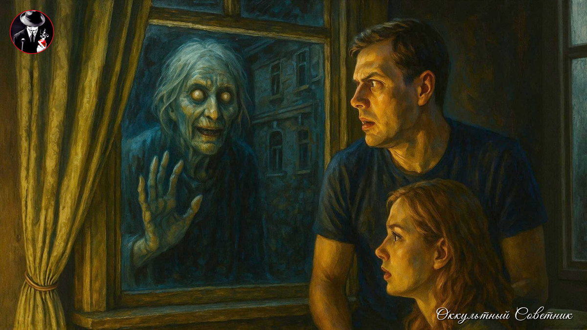За стеклом, прижавшись лицом к окну, стояла старуха. Белые, мутные глаза без зрачков смотрели прямо на него. Кожа серо-зелёного оттенка, как у трупа. Беззубый рот растянулся в жуткой улыбке.