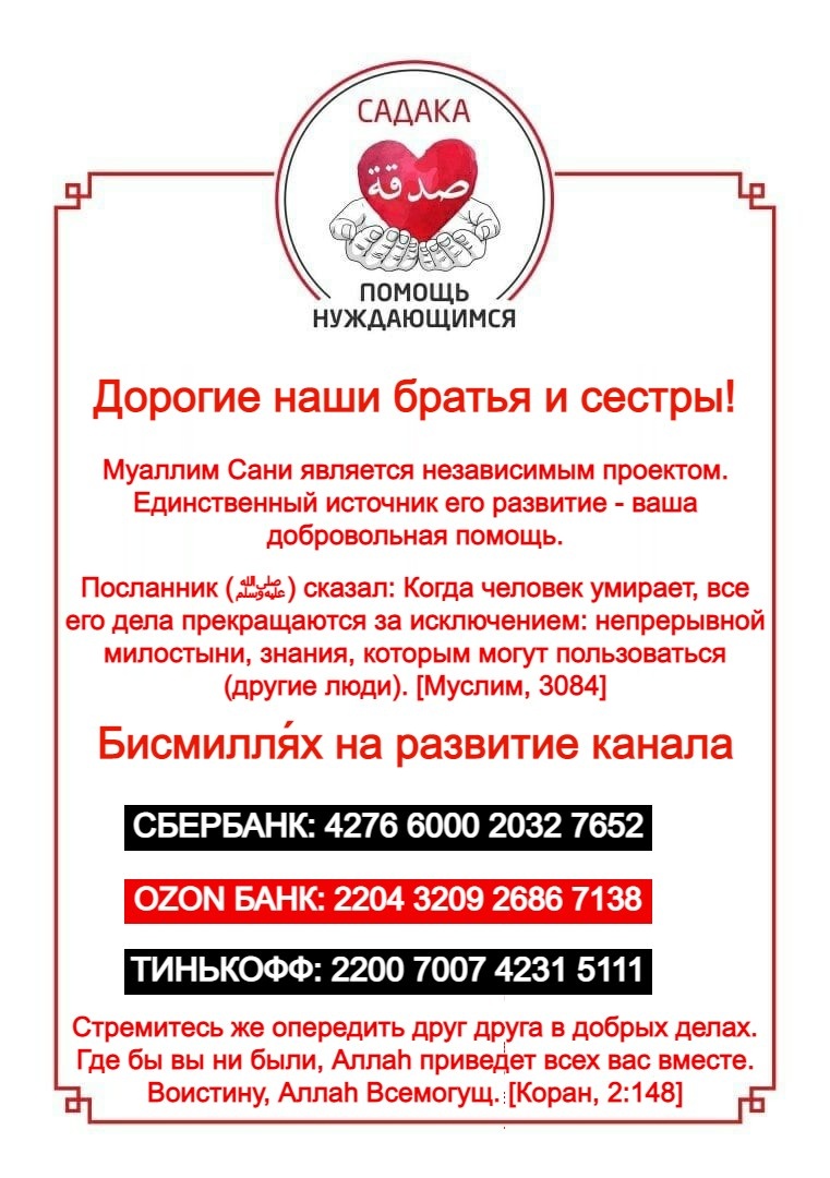 Муаллим Сани является независимым проектом. Единственный источник его развитие - ваша добровольная помощь. Посланник (ﷺ) сказал: Когда человек умирает, все его дела прекращаются за исключением: непрерывной милостыни, знания, которым могут пользоваться (другие люди). [Муслим, 3084] Реквизиты : СБЕРБАНКА: 4276 6000 2032 7652; ТИНЬКОФФ: 2200 7007 4231 5111; OZON БАНК: 2204 3209 2686 7138; ЮMoney. Стремитесь же опередить друг друга в добрых делах. Где бы вы ни были, Аллаh приведет всех вас вместе. Воистину, Аллаh Всемогущ. [Коран, 2:148] #садака / #милостыня / #помощь / #канал / #реквизиты / #ислам Спасибо за вашу поддержку! Пусть Аллаh примет ваш вклад и воздаст вам благом в обоих мирах.