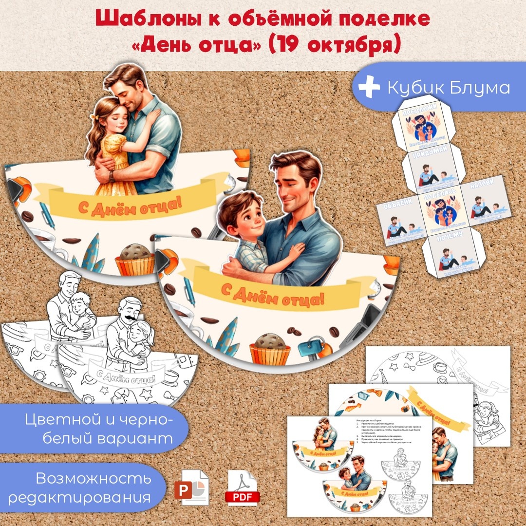Шаблон к объемной поделке «День отца» (19 октября). Материал содержит шаблоны для изготовления поделок и инструкцию по их изготовлению. Подходит для проведения воспитательных мероприятий, тематических и внеурочных занятий, направленных на выражение признательности и уважения к отцам, а также на осознание значимости семейных ценностей. В комплект входит: Какие идеи и темы можно реализовать с помощью данного комплекта материалов: Файл в формате PDF и PPTX. Есть возможность редактирования. Каждая деталь в формате png. Можно менять размеры всех деталей.