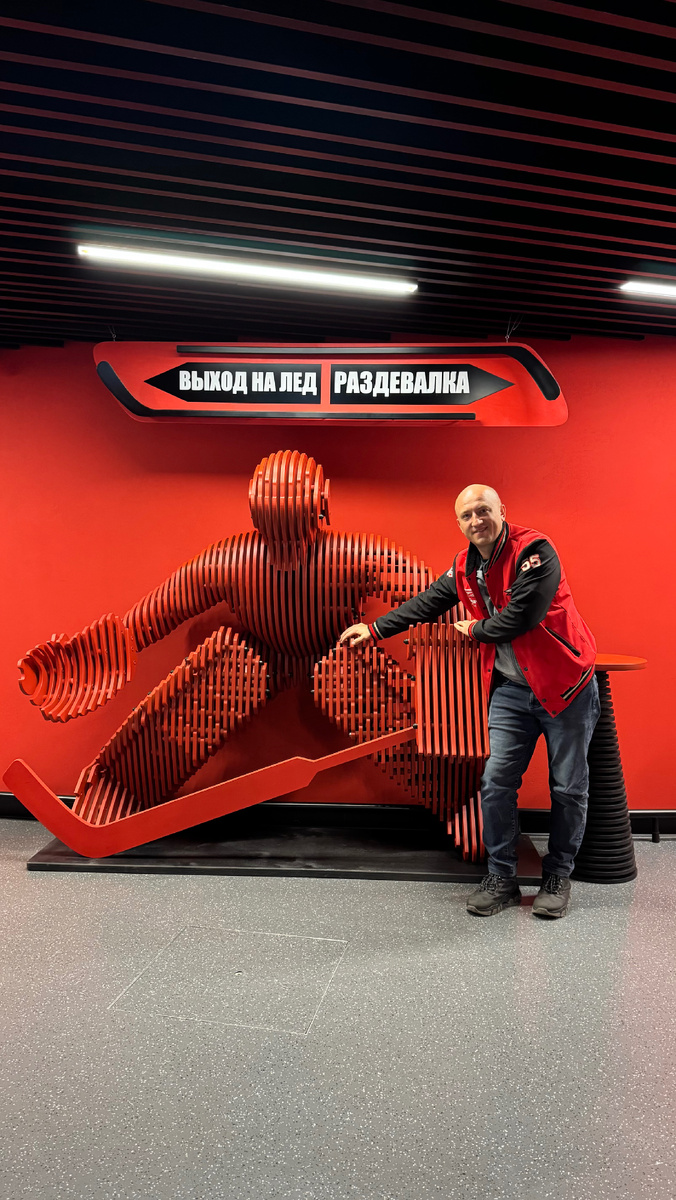 Это самый кинематографичный момент. Тот самый узкий коридор, по которому команда выбегает на лёд. Стоишь в полумраке, впереди – ослепительный свет и сияние ледовой глади. Кажется, еще секунда – и услышишь рёв трибун. Место для фото у скамейки запасных – обязательный пункт программы. Сидишь, пытаешься изобразить суровость тренера, а внутри прыгает семилетний ребенок, который просто любит хоккей.