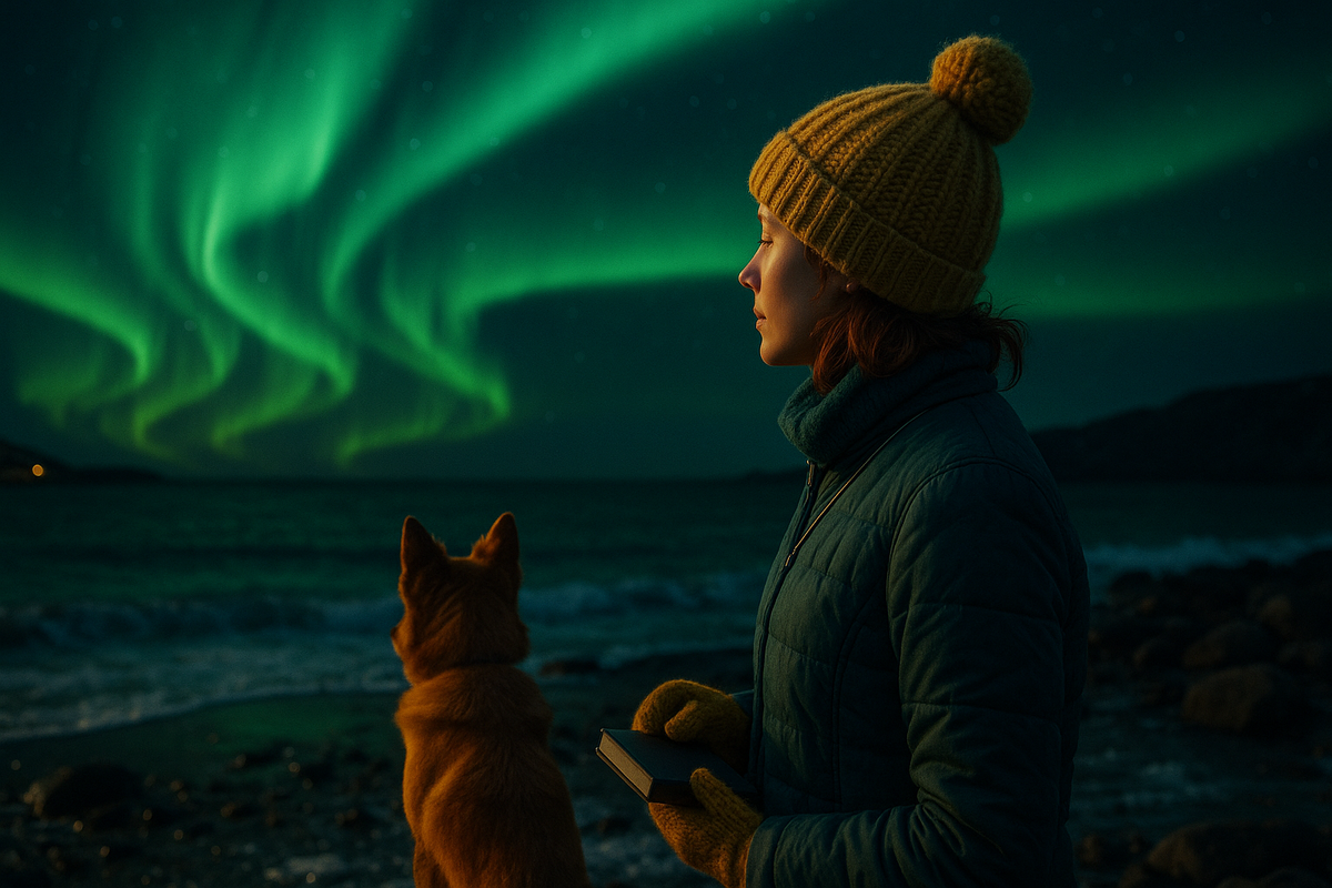 Ночью хозяин постучал в дверь: «Выходите. Началось». На улице воздух был прозрачен, как стекло. Над пустынным пляжем небо распахнулось зелёными занавесями — не огонь, не дым, не туман, а будто сама тьма решила станцевать. Анна стояла, запрокинув голову, и у неё текли слёзы — не от печали, а от того особого счастья, которое приходит, когда мир вдруг становится слишком большим, чтобы о тебе забыть.