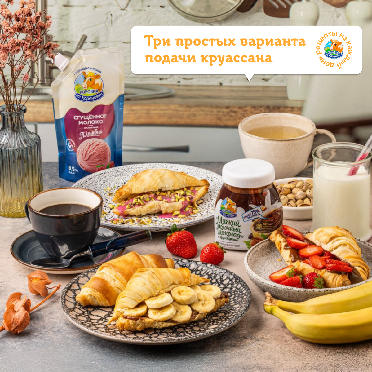 Хотите порадовать близких оригинальным блюдом? Шеф-повар Артём Сенчин подготовил для вас три простых варианта подачи круассана с лакомствами «Коровка из Кореновки» для всей семьи. ❤️