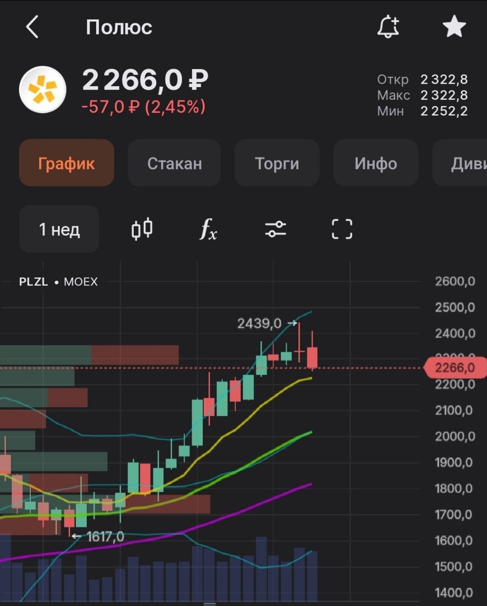 В ответ на пост Паттерн падающая звезда 🌠 и доджи с огромной верхней тенью в ее основании на недельном графике в #PLZL Полюсе с последующим уже и ещё аж межвежьим поглощением говорит о конце тренда и хотя бы временном отдыхе, откате. На дневном графике при этом припали пока что только на уровень мощной EMA55, впервые с 14 июля и уровня еще 1800. То есть пока картина в целом не ужас ужас 😱, но фиксация явно напрашивалась, конечно же, дицергенции Macd/Rsi все в наличии, да и по целям Aromath доехали уже явно, волновая конструкция пока что вся исправно выполнена.