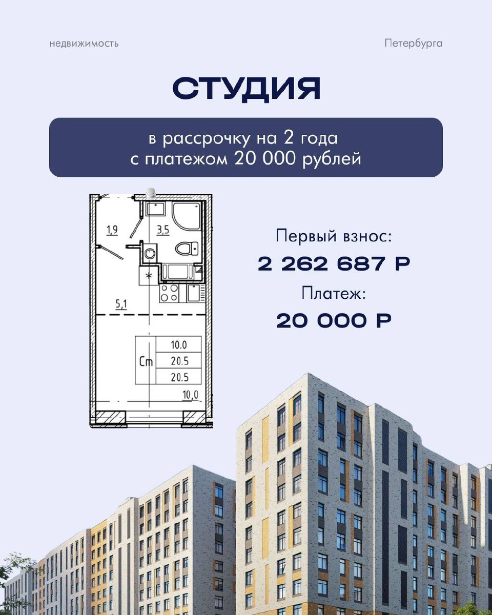 Студия в бизнес-классе в рассрочку с платежом 20 000 ₽ Нашли вариант для тех, кто ищет квартиру у метро, рядом с центром и с минимальным ежемесячным платежом. ↖️ Условия Студия 20,5 м², высокие потолки 2,85 м, увеличенные окна Сдача дома в 4 квартале 2025 года Стоимость: 9 050 750 ₽ Первый взнос: 2 262 687 ₽ (25%) Рассрочка: 20 000 ₽ в месяц на 2 года После двух лет остаток можно перевести в ипотеку 📌 О проекте — Бизнес-класс: система «умный дом», современные инженерные решения — Дворы без машин, видеонаблюдение, охрана — Колясочные, кладовые, коворкинг, спортивные и лаундж-зоны — Своя инфраструктура: школа, детсад, магазины, сервисы — До центра и Ладожского вокзала — 7 минут — 10 минут пешком до «Охта Молл» и креативного квартала Design District DAA — Парк, культурные и спортивные пространства — всё в шаговой доступности Хотите узнать больше о планировках и вариантах отделки? Пишите нам в личные сообщения.